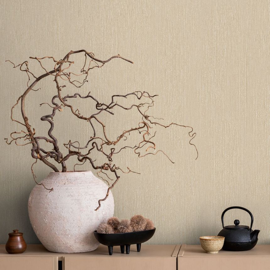 Vinil felületű tapéta, függőleges textúrával, amely a fa erezetét idézi, bézs árnyalatokban.