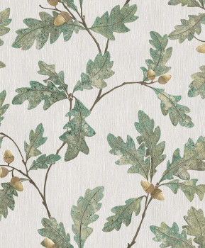 Vinil felületű tapéta, szürke csíkozott textúrával, tölgyág mintával, zöld és barna árnyalatokban.