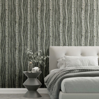 Vinil felületű tapéta, csíkozott textúrával, nyírfaligetet ábrázoló mintával, zöld árnyalatokban.