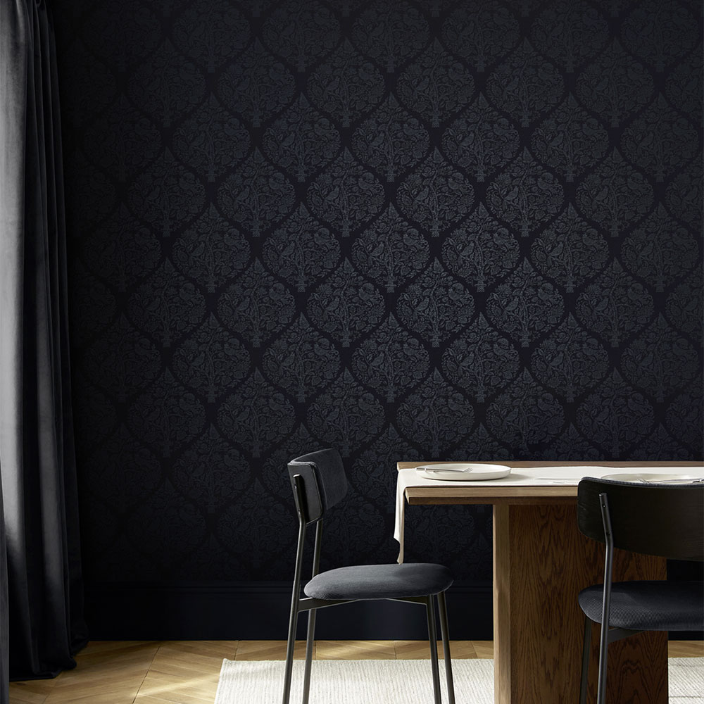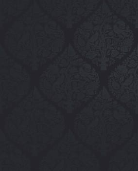 Vlies tapéta, matt sötétkék alap, félig fényes, metálos díszítőminta növényekkel és madarakkal.