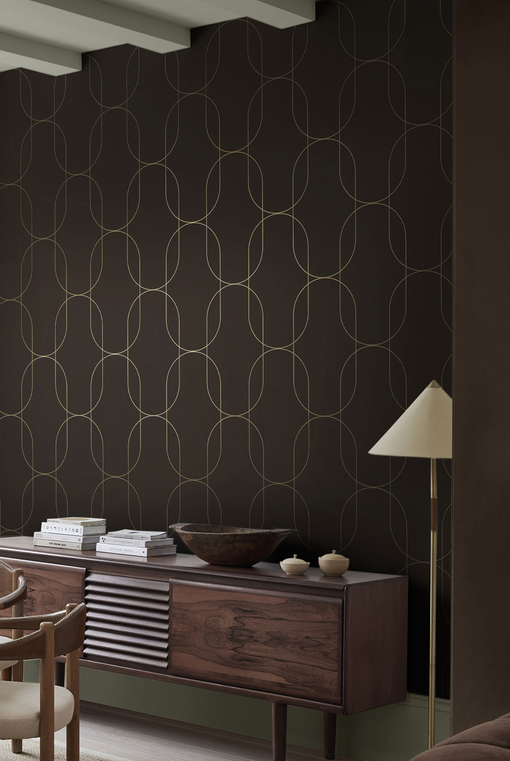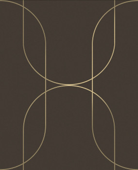 Vlies tapéta, matt, finom szálas textúrájú, sötétbarna színű, félig fényes arany vonalakkal.