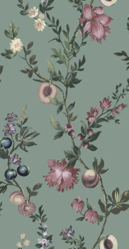 Vlies tapéta, zöld alapon, virágokkal és gyümölcsökkel díszített gallyak.
