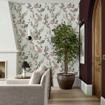 Vlies tapéta, meleg fehér alap szürkés-zöldes árnyalattal, virágokkal és gyümölcsökkel díszített gallyak zöld, rózsaszín és szilvás árnyalatokban.