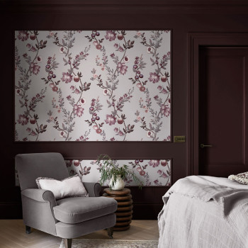 Vlies tapéta, rózsaszín alapon, virágokkal és gyümölcsökkel díszített gallyak rózsaszín árnyalatokban.