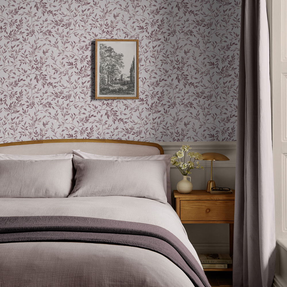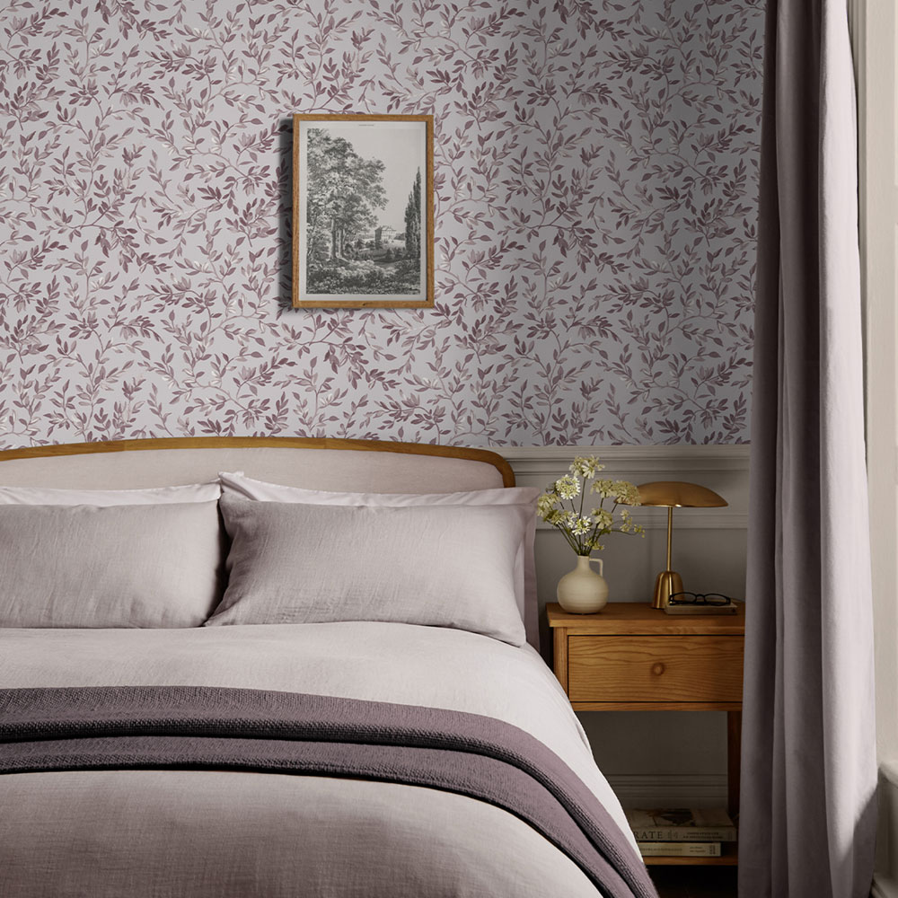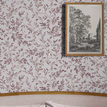 Vlies tapéta, gallyak és levelek motívummal, rózsaszín árnyalatokban.