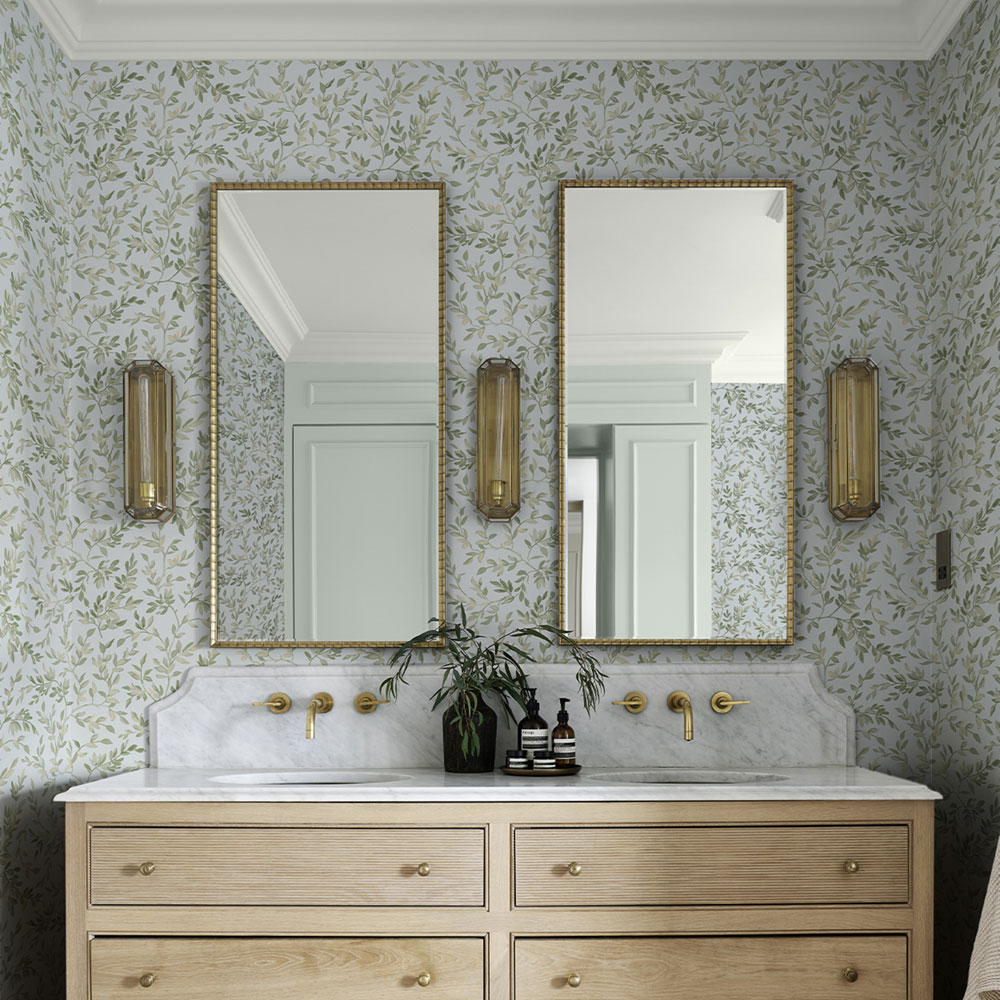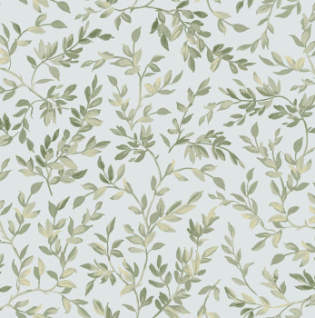 Vlies tapéta, világoskék alap, zöld árnyalatú leveles gallyakkal díszítve.