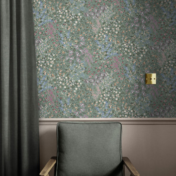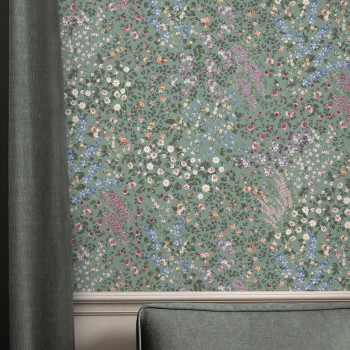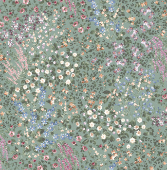 Vlies tapéta, zöld alapon, virágmintás, zöld, rózsaszín, kék, narancssárga és lila árnyalatokban.