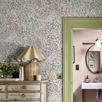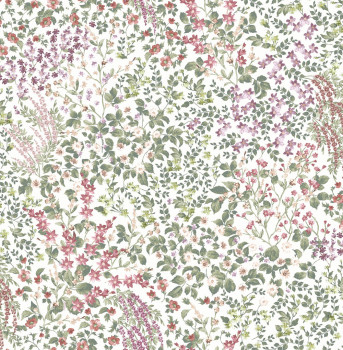 Vlies tapéta, fehér alap, virágmintás, zöld, rózsaszín, piros és lila árnyalatokban.