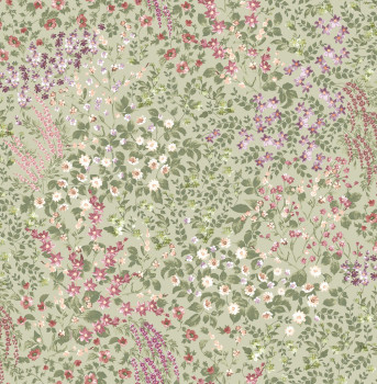 Vlies tapéta, zöld alapon, virágmintás, zöld, rózsaszín és lila árnyalatokban.