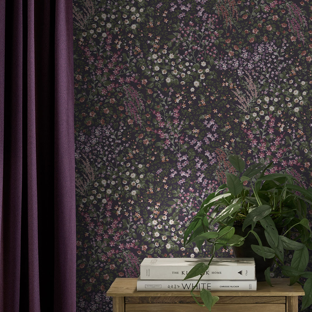 Vlies tapéta, sötétlila alapszín, virágmintás, zöld, lila, rózsaszín és narancssárga árnyalatokban.