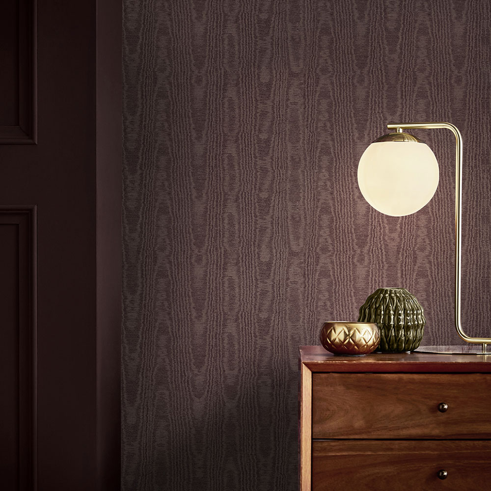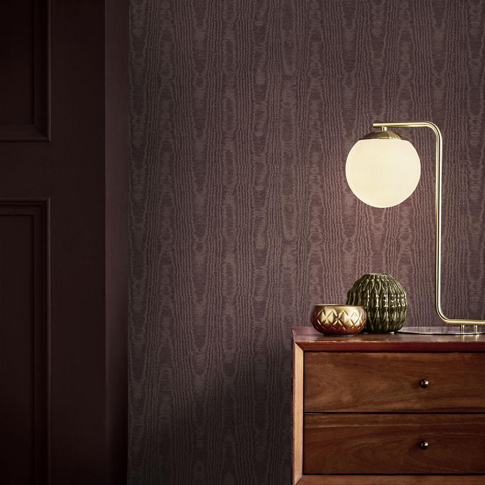 Vlies tapéta, félig fényes, látványos moaré mintázat, amely faerezetet idéz, régirózsaszín/bordó árnyalatokban.