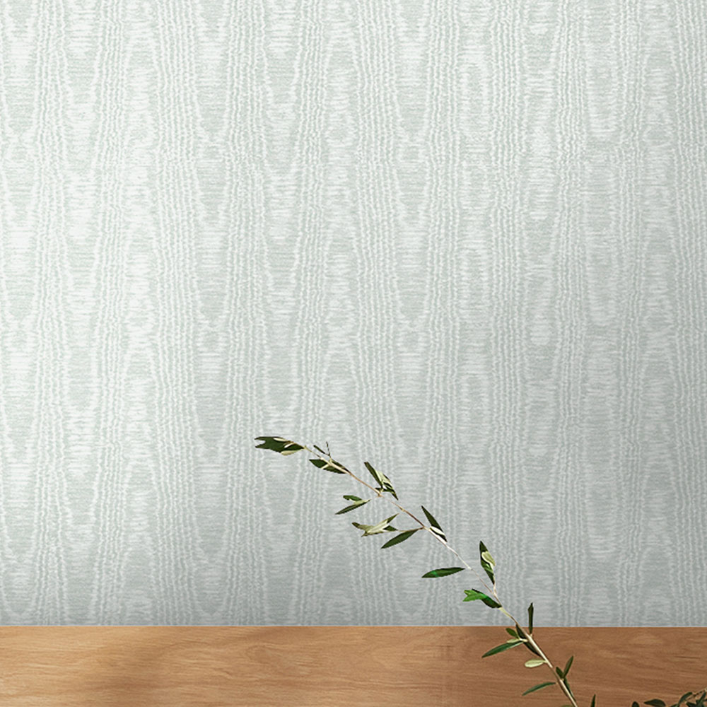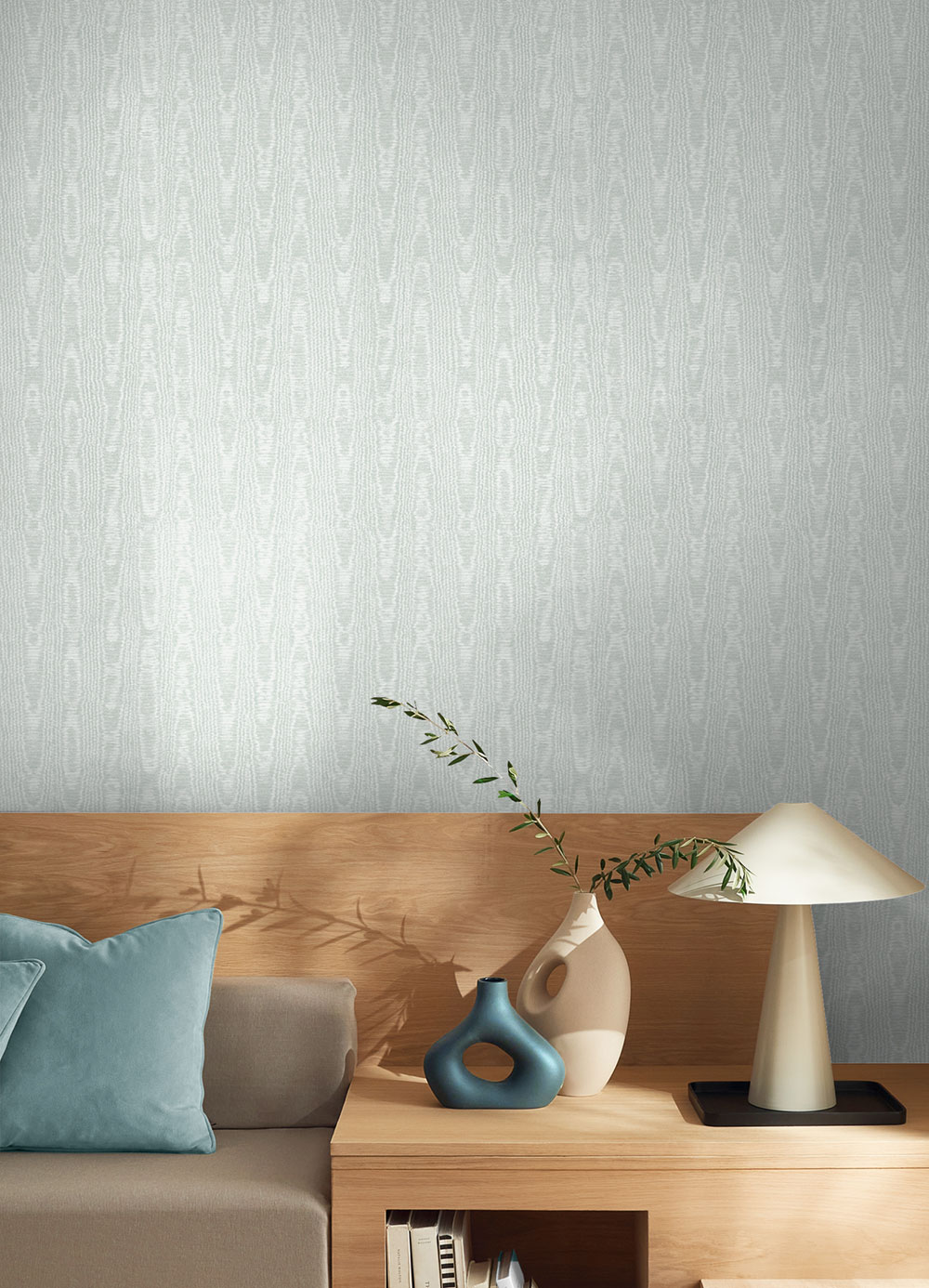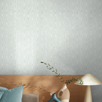 Vlies tapéta, félig fényes halványkék / kacsa kék / látványos moaré mintázat, amely a fa erezetét idézi.