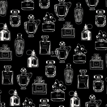 Vlies matt fekete tapéta parfümös üvegek motívumával.