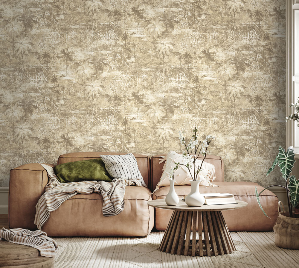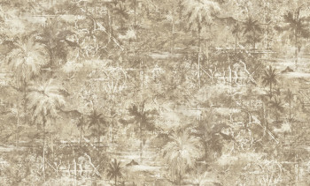 Vinil felületű vlies tapéta, pálmafákkal díszítve, barna-bézs árnyalatokban, szövethatású textúrával.