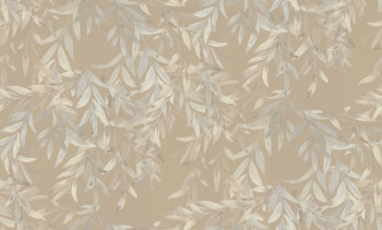 Vinil felületű vlies tapéta, sötét bézs alapszín, bézs árnyalatú ágacskák és levelek – helyenként finom metálos fényű, szövethatású textúra.