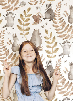 Vidám, gyermekszobába való vlies tapéta, állatokkal és levelekkel, fehér alapon, barna és szürke árnyalatú állatokkal, valamint rózsaszín és arany színű levelekkel.