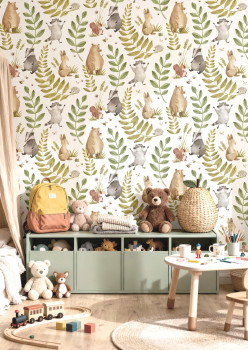 Vidám, gyermekszobába való flisz tapéta, állatokkal és levelekkel, fehér alapon, arany, barna és szürke árnyalatú állatokkal, zöld és arany levelekkel.