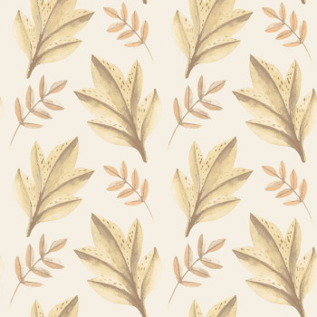 Sima, nem szőtt tapéta, fehér alapon, nagyobb, 20 cm hosszú barna-bézs levelekkel, valamint kisebb, 15 cm hosszú narancssárga-barna-szürke levelekkel.