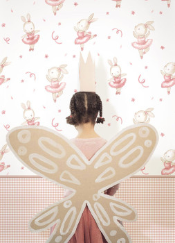 Finom, gyermekszobába való flisz tapéta, táncoló nyuszik, fehér alapon, rózsaszín, bézs és barna színű nyuszik.