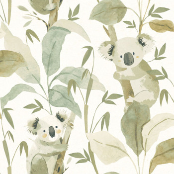 Vidám, gyermekszobába való flis tapéta: koala mackók és növények zöld, arany és szürke árnyalatokban, zöld-fehér alapon.