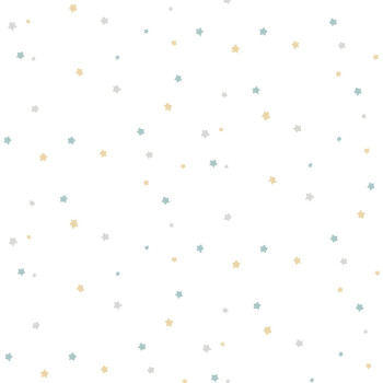 Sima, nem szőtt tapéta, fehér alapon, kék, arany és szürke csillagokkal, 0,5 és 1 cm-es méretben.