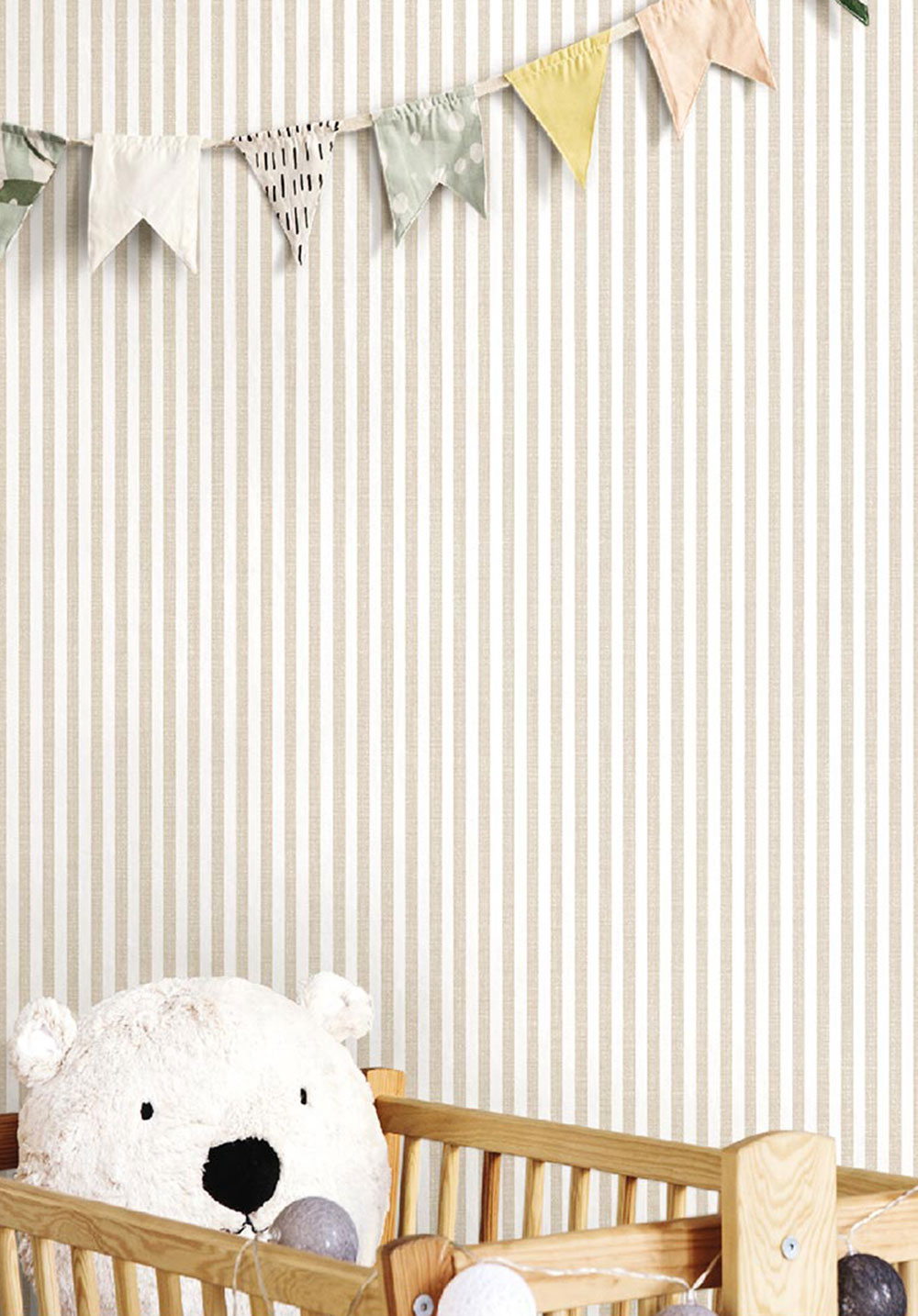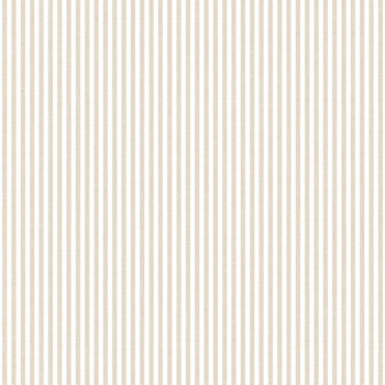 Vlies tapéta, finom textúrával, bézs-fehér színben, 6 mm széles csíkokkal.