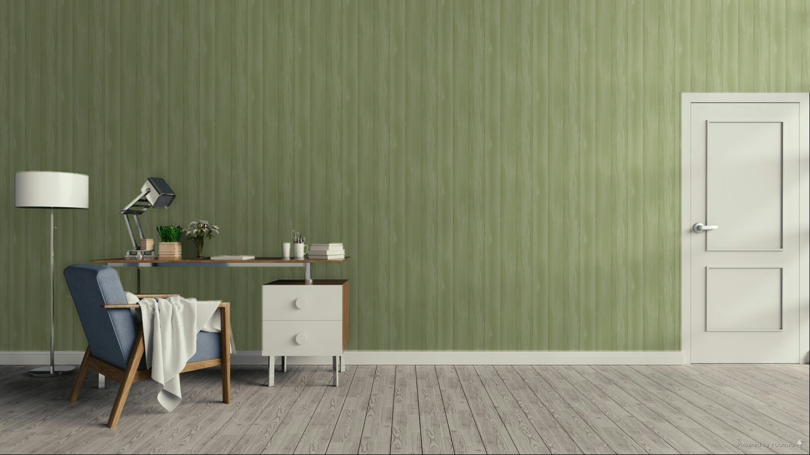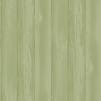 Sima, zöld, nem szőtt tapéta; az árnyékolás 8 cm széles fa deszkák hatását kelti.