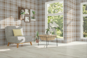 Vlies tapéta, finom textil textúrával, kockás szövetet utánzó mintával, barna, bézs és fehér árnyalatokban.