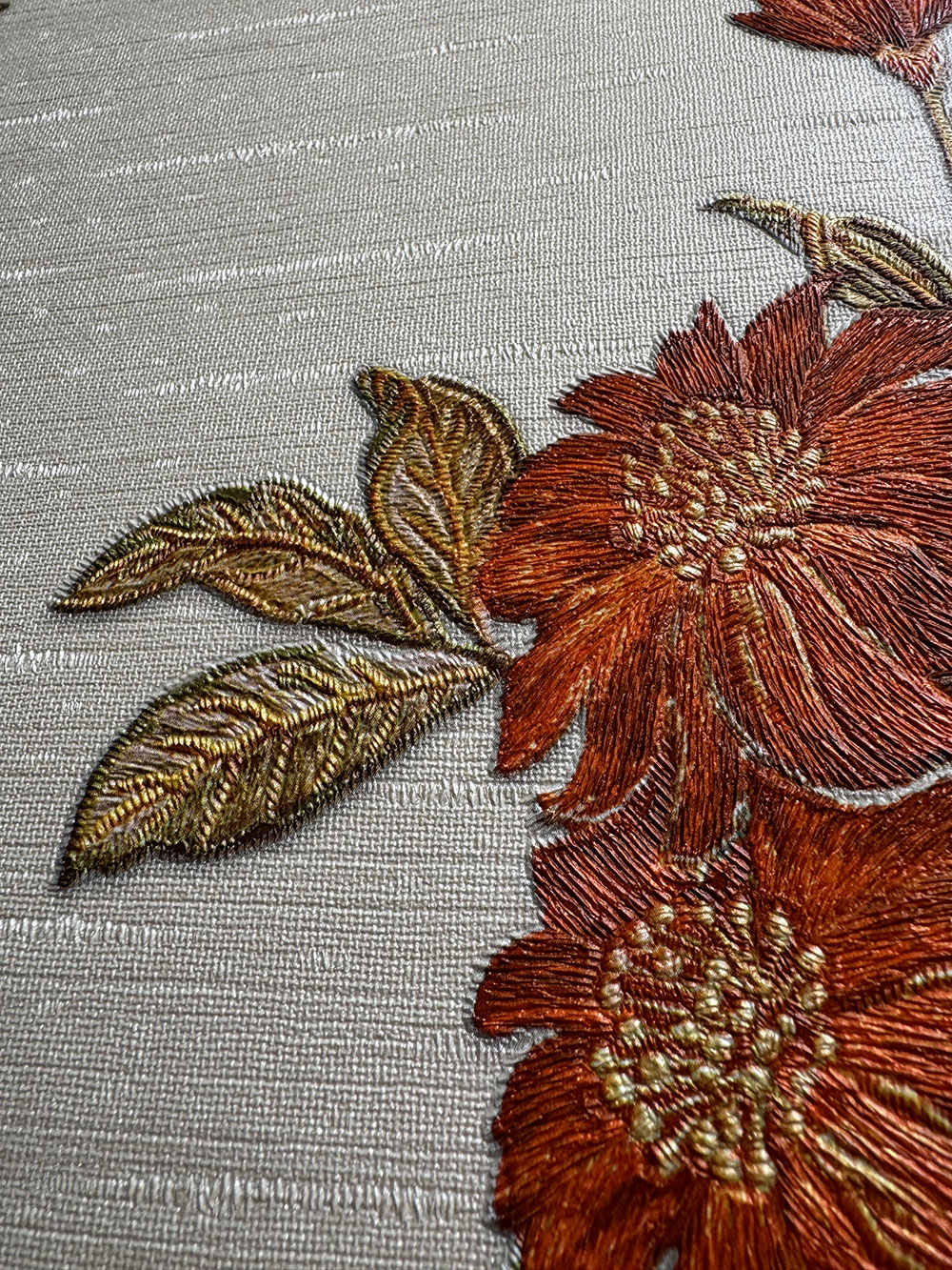 Luxus vlies tapéta világos bézs háttérrel és fémes narancssárga virágokkal, szövet textúra.