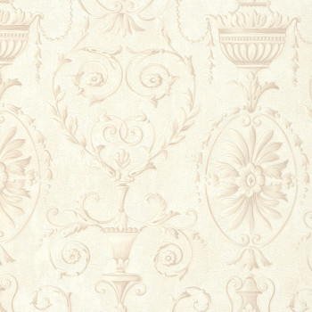 Luxus vlies tapéta barokk virág- és vázaornamentikával, durva, világos bézs stukkó háttéren.