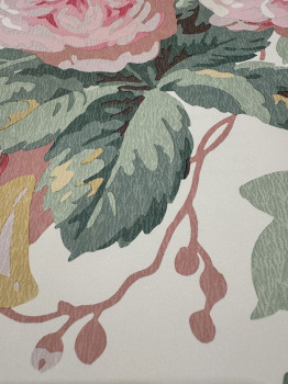 A rózsaszín bazsarózsa virágokkal díszített vlies tapéta fehér, sima háttéren romantikus hangulatot varázsol a belső térbe.