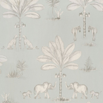 Szürkészöld gyapjú tapéta gyerekszobába - gyerek tapéta - elefántok, zebrák, leopárdok, pálmafák.