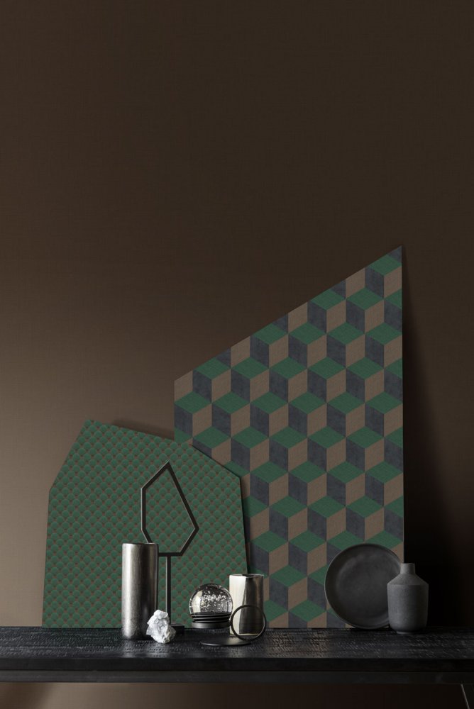Vliesová tapéta vinil vinil felső réteg, geometrikus mintával -műanyag zöld pöttyök barna háttéren.