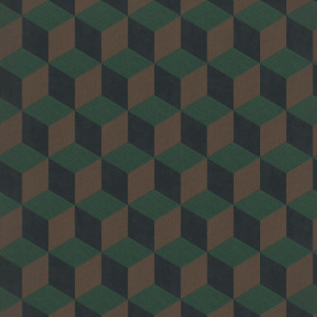 Geometrikus, 3D hatású vlies tapéta, zöld, fekete és barna árnyalatú kockákkal, szövet textúrával.